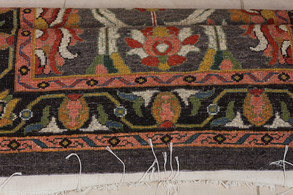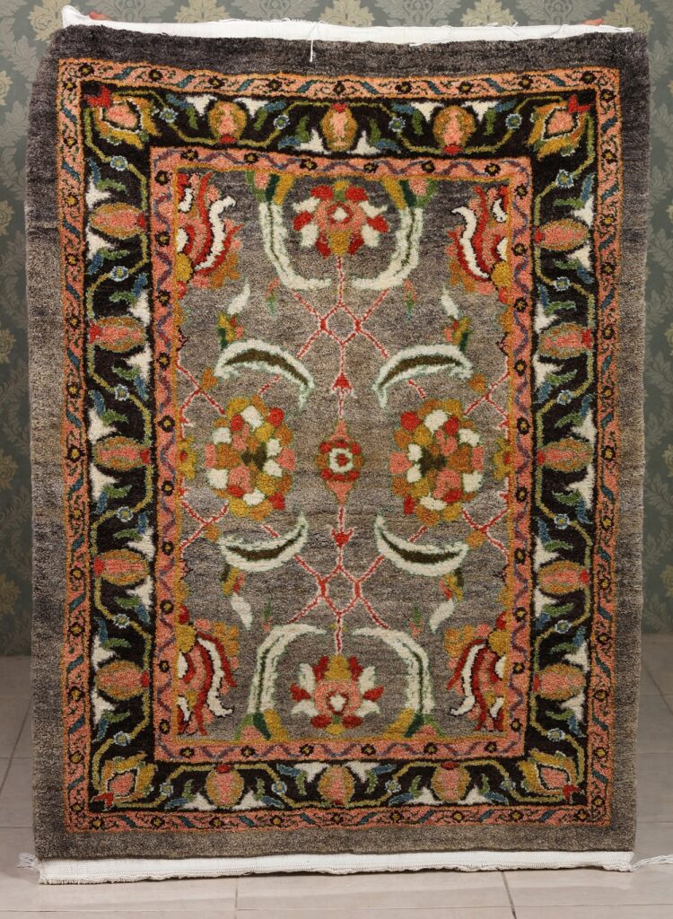 زمینهٔ یشمیـخاکستری فرش، بازتاب سکون زمین است؛ همان زمینِ آرامِ پس از برداشت، و نقشهای گرم نارنجی، سرخ و زرد، تصویری از برگهاییست که در نور مهر، بر خاک مینشینند.